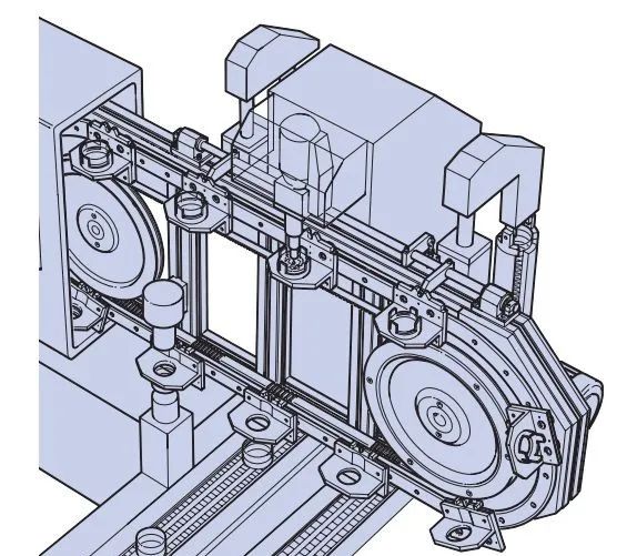 如果應用除了需要垂直安裝之外,環(huán)形流水線要傳輸?shù)墓ぜ^長,只有一條環(huán)形導軌垂直安裝,會形成懸臂而導致較大的翻轉(zhuǎn)力矩,這時可以采用兩條環(huán)形導軌平行相對,垂直安裝。