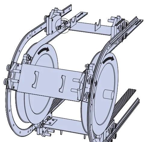 如果工件特別長,那兩條環(huán)形導(dǎo)軌就會(huì)需要離得比較遠(yuǎn),這樣的話,如果想達(dá)到合適的安裝平行度,會(huì)比較麻煩。在使用過程中,也需要很好地控制住這個(gè)平行度,為了克服這些麻煩,可以采用一邊是V型環(huán)形導(dǎo)軌,一邊是矩形環(huán)導(dǎo)軌。和V型環(huán)形導(dǎo)軌配套使用的是V型滾輪;和矩形環(huán)形導(dǎo)軌配套使用的是外球面滾輪;這樣的話,就簡便了安裝工作。