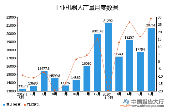 附表:2020年1-2月全國(guó)工業(yè)機(jī)器人產(chǎn)量累計(jì)值為21292套,累計(jì)下降19.4%。2020年3月全國(guó)工業(yè)機(jī)器人產(chǎn)量為17241套,累計(jì)值為34645.3套,同比增長(zhǎng)12.9%,累計(jì)下降8.2%。2020年4月全國(guó)工業(yè)機(jī)器人產(chǎn)量為19257套,累計(jì)值為54602.3套,同比增長(zhǎng)26.6%,累計(jì)增長(zhǎng)4%。2020年5月全國(guó)工業(yè)機(jī)器人產(chǎn)量為17794套,累計(jì)值為72619套,同比增長(zhǎng)16.9%,累計(jì)增長(zhǎng)6.7%。2020年6月全國(guó)工業(yè)機(jī)器人產(chǎn)量為20761套,累計(jì)值為93794套,同比增長(zhǎng)29.2%,累計(jì)增長(zhǎng)10.3%。