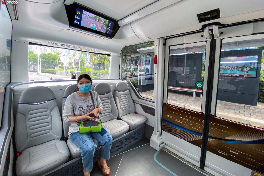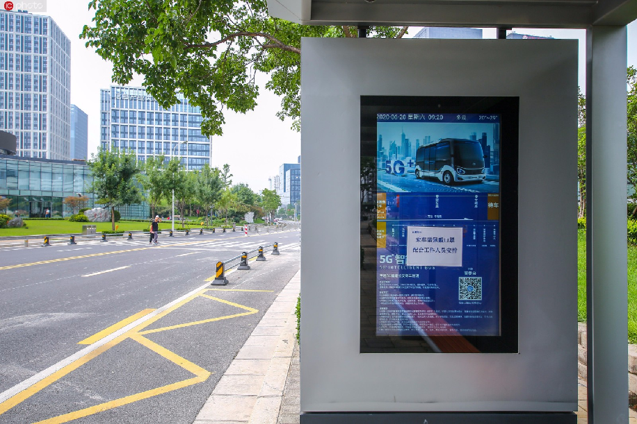 2020年7月23日,河南省鄭州市,鄭東新區(qū)龍子湖智慧島的5G無人駕駛公交車試運行已超一年。運行以來,這條公交線路已安全行駛超3萬公里,免費搭乘體驗的市民超2萬人次。(來源:東方IC)