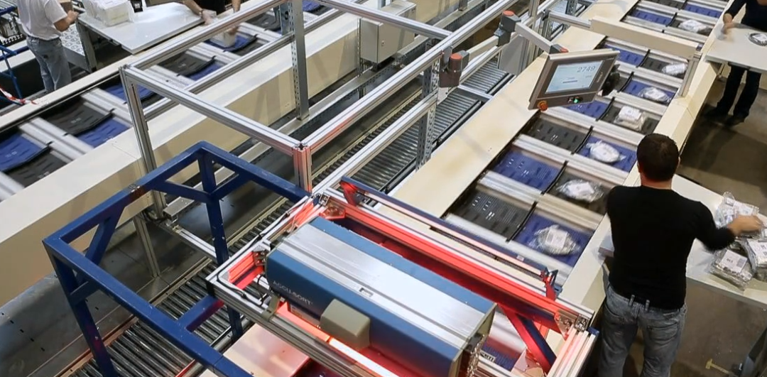 兩套分揀系統(tǒng)將訂單處理流程變得井然有序,落袋式分揀系統(tǒng)按照訂單需求將單件產品分揀到紙箱,通過運輸線傳送至快速翻板分揀系統(tǒng);然后翻板分揀系統(tǒng)直接將訂單分揀出庫。Eurodif根據(jù)需求調整落袋式分揀系統(tǒng)的速度,單件訂單流程變得靈活自由。