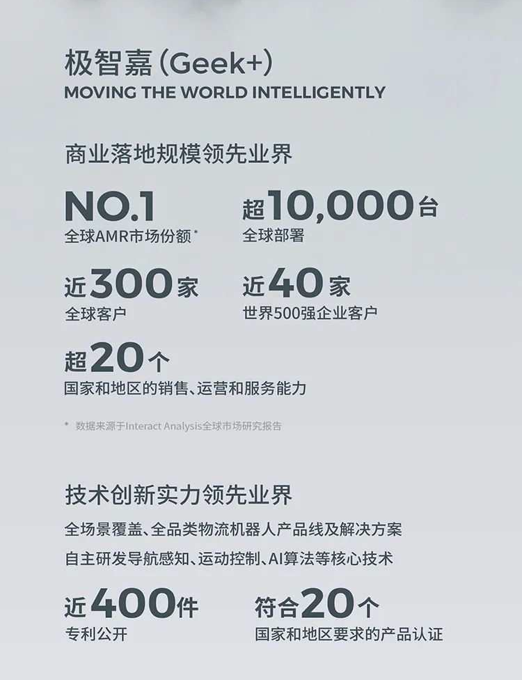 極智嘉(Geek+)是一家引領(lǐng)全球智慧物流變革的智能機(jī)器人公司,在全球AMR市場(chǎng)占有率高達(dá)10%,占據(jù)市場(chǎng)領(lǐng)先地位。同時(shí)也是英特爾&硬蛋機(jī)器人創(chuàng)新生態(tài) - 產(chǎn)學(xué)研優(yōu)秀合作伙伴。極智嘉應(yīng)用先進(jìn)的機(jī)器人和人工智能技術(shù),打造高效、柔性、可靠的解決方案,幫助全球各行業(yè)的企業(yè)提升物流效率,實(shí)現(xiàn)智能化升級(jí)。