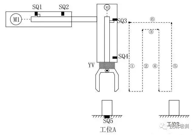 如上圖所示,M1為控制機械手左右移動的電動機,M2為控制機械手上下升降的電動機,YV線圈用來控制機械手夾緊防松,SQ1為左到位檢測開關(guān),SQ2為右到位檢測開關(guān),SQ3為上到位檢測開關(guān),SQ4為下到位檢測開關(guān) ,SQ5為工件檢測開關(guān)。