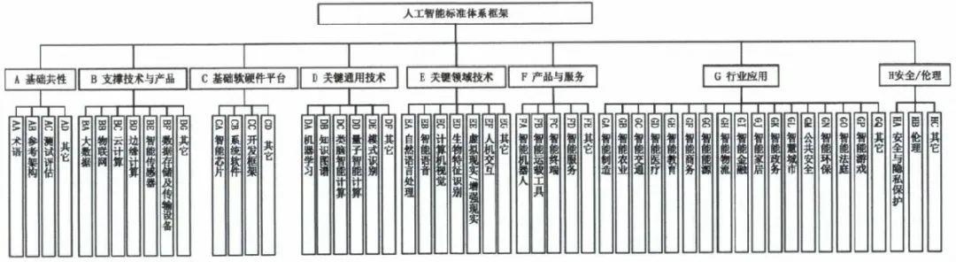 其中,A基礎(chǔ)共性標(biāo)準(zhǔn)包括術(shù)語、參考架構(gòu)、測試評估三大類,位于人工智能標(biāo)準(zhǔn)體系結(jié)構(gòu)的最左側(cè),支撐標(biāo)準(zhǔn)體系結(jié)構(gòu)中其它部分; B支撐技術(shù)與產(chǎn)品標(biāo)準(zhǔn)對人工智能軟硬件平臺建設(shè)、算法模型開發(fā)、人工智能應(yīng)用提供基礎(chǔ)支撐; C基礎(chǔ)軟硬件平臺標(biāo)準(zhǔn)主要圍繞智能芯片、系統(tǒng)軟件、開發(fā)框架等方面,為人工智能提供基礎(chǔ)設(shè)施支撐; D關(guān)鍵通用技術(shù)標(biāo)準(zhǔn)主要圍繞機器學(xué)習(xí)、知識圖譜、類腦智能計算、量子智能計算、模式識別等方面,為人工智能應(yīng)用提供通用技術(shù)支撐; E關(guān)鍵領(lǐng)域技術(shù)標(biāo)準(zhǔn)主要圍繞自然語言處理、智能語音、計算機視覺、生物特征識別、虛擬現(xiàn)實/增強現(xiàn)實、人機交互等方面,為人工智能應(yīng)用提供領(lǐng)域技術(shù)支撐; F產(chǎn)品與服務(wù)標(biāo)準(zhǔn)包括在人工智能技術(shù)領(lǐng)域中形成的智能化產(chǎn)品及新服務(wù)模式的相關(guān)標(biāo)準(zhǔn); G行業(yè)應(yīng)用標(biāo)準(zhǔn)位于人工智能標(biāo)準(zhǔn)體系結(jié)構(gòu)的最頂層,面向行業(yè)具體需求,對其它部分標(biāo)準(zhǔn)進(jìn)行細(xì)化,支撐各行業(yè)發(fā)展; H安全/倫理標(biāo)準(zhǔn)位于人工智能標(biāo)準(zhǔn)體系結(jié)構(gòu)的最右側(cè),貫穿于其他部分,為人工智能建立合規(guī)體系。 標(biāo)準(zhǔn)研制方向明細(xì)表見附表。(二)人工智能標(biāo)準(zhǔn)體系框架人工智能標(biāo)準(zhǔn)體系框架主要由基礎(chǔ)共性、支撐技術(shù)與產(chǎn)品、基礎(chǔ)軟硬件平臺、關(guān)鍵通用技術(shù)、關(guān)鍵領(lǐng)域技術(shù)、產(chǎn)品與服務(wù)、行業(yè)應(yīng)用、安全/倫理八個部分組成,如圖2所示。