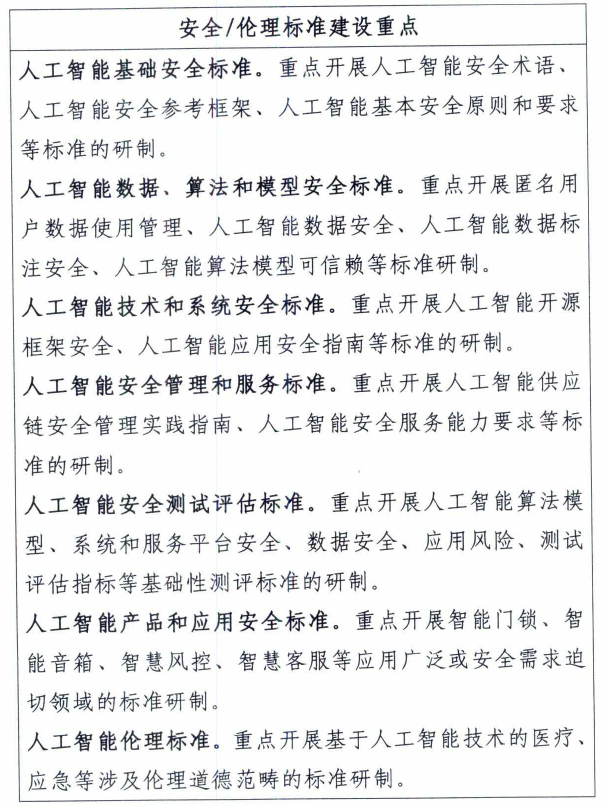 人工智能產(chǎn)品和應(yīng)用安全標(biāo)準(zhǔn)主要是為保障人工智能技術(shù)、服務(wù)和產(chǎn)品在具體應(yīng)用場景下的安全,可面向智能門鎖、智能音響、智慧風(fēng)控、智慧客服等應(yīng)用成熟、使用廣泛或安全需求迫切的領(lǐng)域進(jìn)行標(biāo)準(zhǔn)研制。