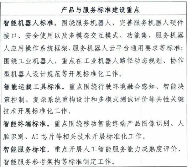 圖8產(chǎn)品與服務(wù)標(biāo)準(zhǔn) 1.智能機器人標(biāo)準(zhǔn)。結(jié)合《國家機器人標(biāo)準(zhǔn)體系建設(shè)指南》工作部署,在服務(wù)機器人方面,完善服務(wù)機器人硬件接口、安全使用以及多模態(tài)交互模式、功能集、服務(wù)機器人應(yīng)用操作系統(tǒng)框架、服務(wù)機器人云平臺通用要求等標(biāo)準(zhǔn);在工業(yè)機器人方面,重點在工業(yè)機器人路徑動態(tài)規(guī)劃、協(xié)作型機器人設(shè)計等開展標(biāo)準(zhǔn)化工作。