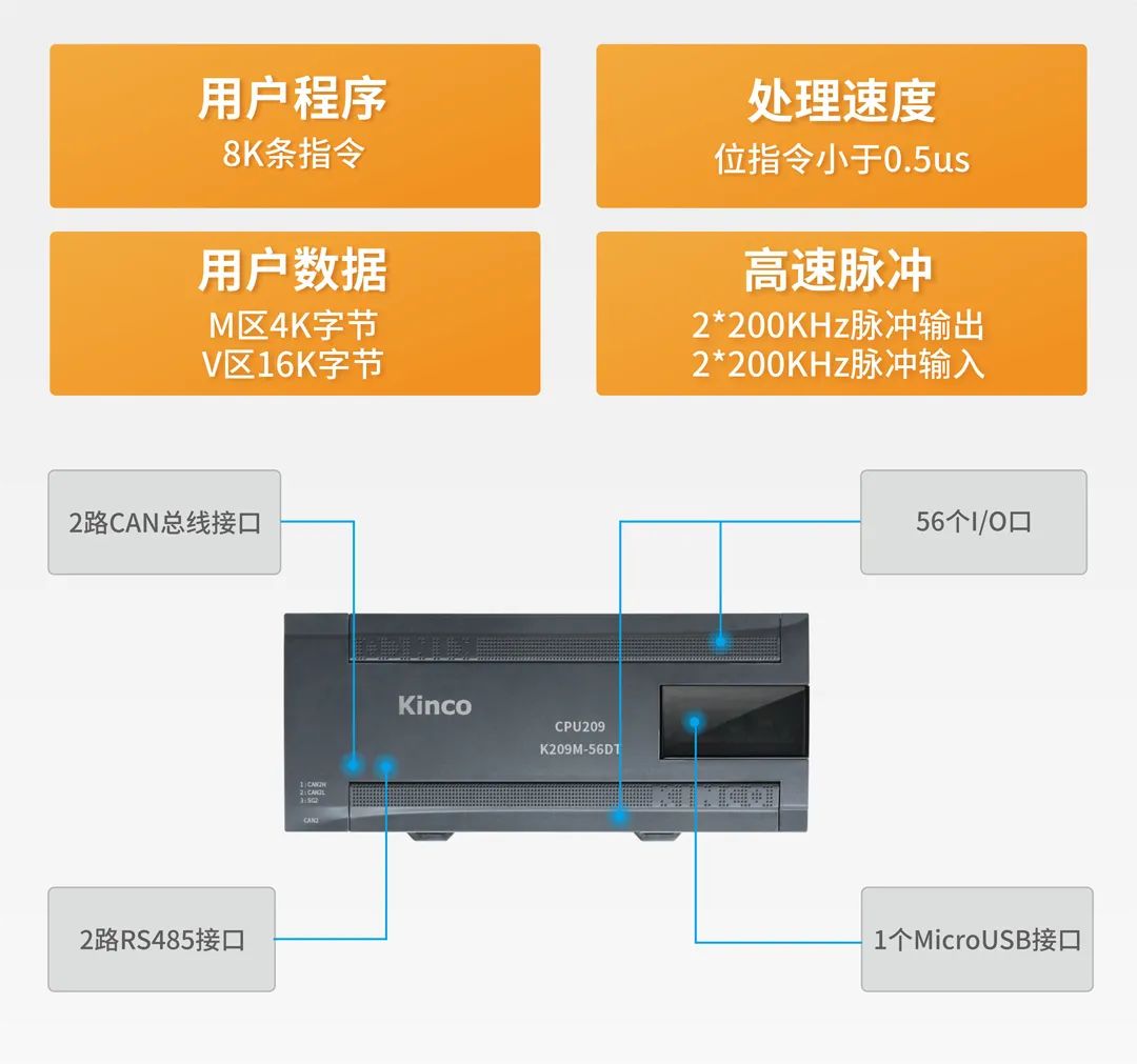 在處理速度上,K209M的位指令小于0.5us。當啟用全部通信功能、高速脈沖功能時,一個1K指令的測試程序(含60%位指令,30%整數(shù)運算指令,10%浮點運算指令)的掃描周期小于0.37ms。