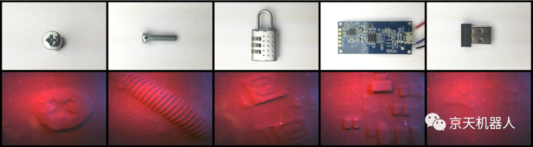 標(biāo)準(zhǔn)的GelSight傳感器(如左下圖所示)使用現(xiàn)成的網(wǎng)絡(luò)攝像頭來捕獲硅膠凝膠皮膚變形的高分辨率圖像。凝膠皮膚的內(nèi)表面用彩色LED照明,為觸覺圖像提供足夠的照明。