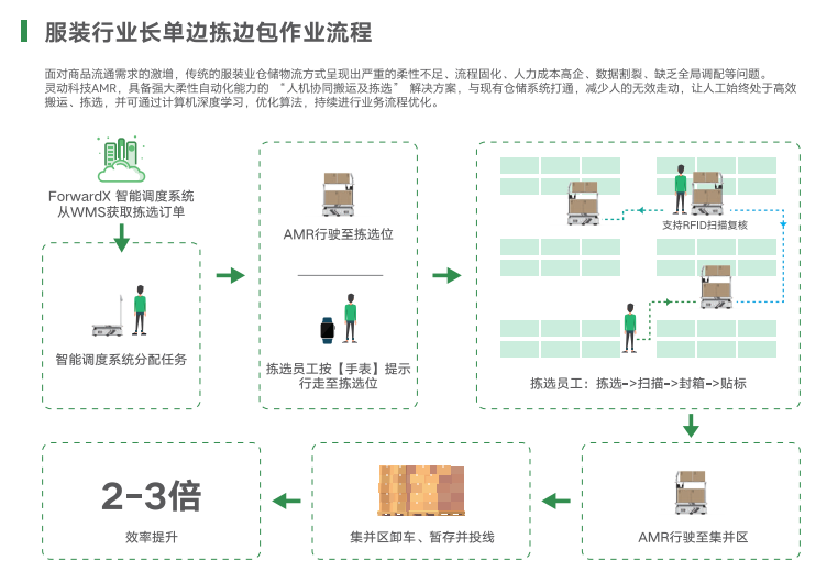 以Flex200服務(wù)的全球TOP3快時(shí)尚巨頭為例,靈動(dòng)科技既改變其原有人工紙單揀選操作流程,也優(yōu)化了其揀選工人的無(wú)效走動(dòng),并進(jìn)而通過(guò)大數(shù)據(jù)深度學(xué)習(xí),持續(xù)優(yōu)化算法調(diào)度策略,持續(xù)改進(jìn)人機(jī)協(xié)同、流程優(yōu)化,最終達(dá)成人工成本下降50%以上、UPH(units per hour,每小時(shí)產(chǎn)能)上升2~3倍。