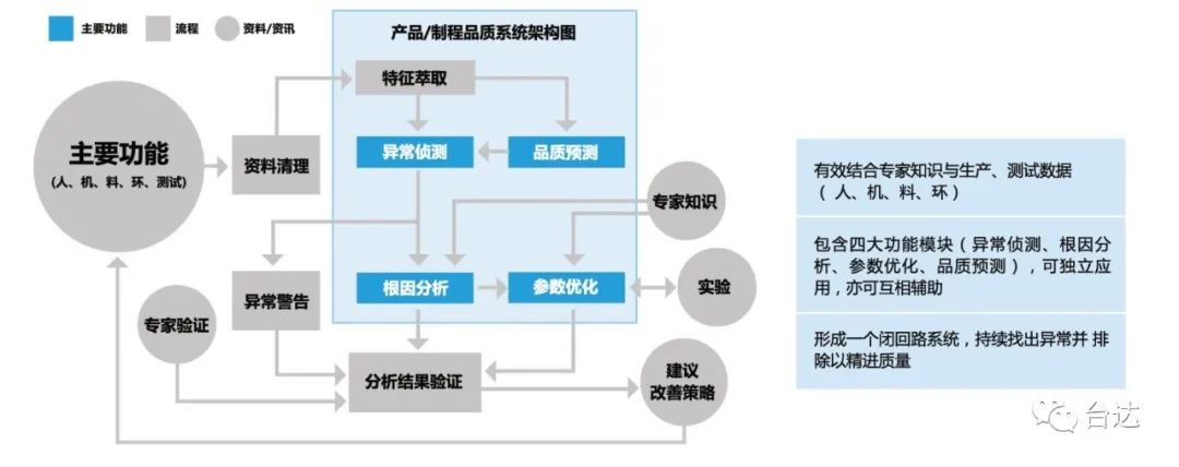 臺(tái)達(dá)根因分析系統(tǒng)的實(shí)施架構(gòu)臺(tái)達(dá)推出的根因分析系統(tǒng)包括數(shù)據(jù)采集、數(shù)據(jù)整備、分析建模與系統(tǒng)整合等功能,其核心過程為:將設(shè)備狀態(tài)數(shù)據(jù)、工藝數(shù)據(jù)、質(zhì)量數(shù)據(jù)、設(shè)備參數(shù)等信息采集,并進(jìn)行數(shù)據(jù)清理/整合等處理,然后對(duì)數(shù)據(jù)進(jìn)行建模與分析,自動(dòng)推薦其質(zhì)量異常產(chǎn)生原因,并將新產(chǎn)生異常原因及其相關(guān)知識(shí)存儲(chǔ)到數(shù)據(jù)庫。同時(shí),該系統(tǒng)可以與其他管理系統(tǒng)集成,從而優(yōu)化設(shè)計(jì)、工藝、參數(shù)設(shè)置等。