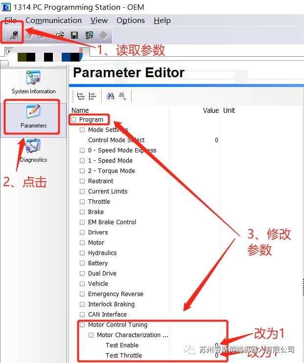 使用1314軟件,點(diǎn)擊Parameters。點(diǎn)擊Motor Control Tuning->IM Motor Characterization Tests-> Enable調(diào)成1(會聽到清脆的”卡擦”聲音)-> Test Throttle調(diào)成1行走電機(jī)會開始匹配,從低速慢慢的變成高速。最后”咔擦”停止。重啟急停即可。