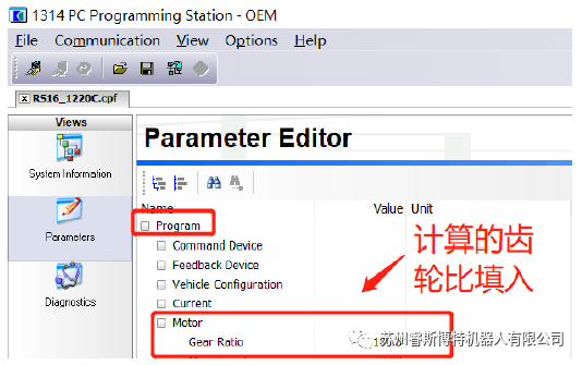 驅(qū)動輪上的大齒輪數(shù)÷轉(zhuǎn)向電機(jī)上的齒數(shù)×轉(zhuǎn)向電機(jī)的齒輪比,將計(jì)算值填入圖中,或者按照改造前的叉車的1220E中的參數(shù)讀出去也可以的。