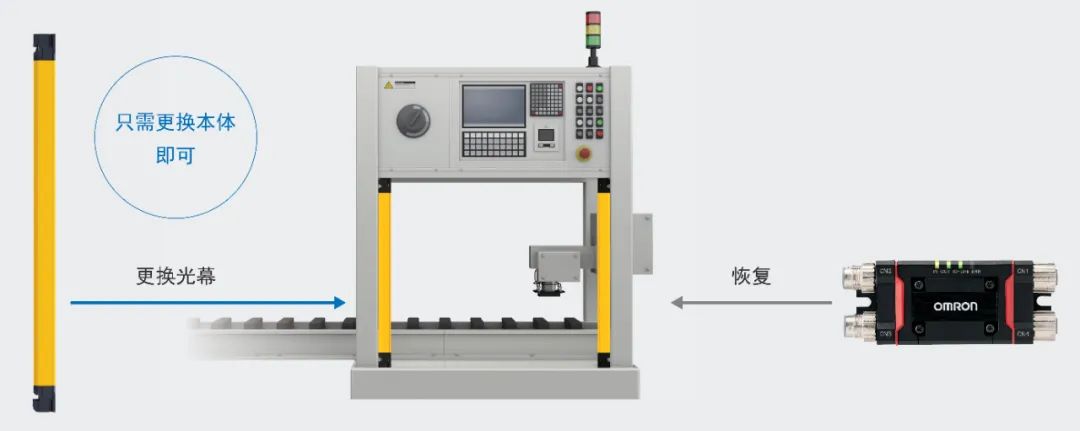 通過Plug&Work快速更換,如果長期安裝智能連接器,因故障更換的光幕將自動(dòng)恢復(fù)到更換前的相同設(shè)定。無經(jīng)驗(yàn)者都可輕松更換光幕并立即恢復(fù)裝置。