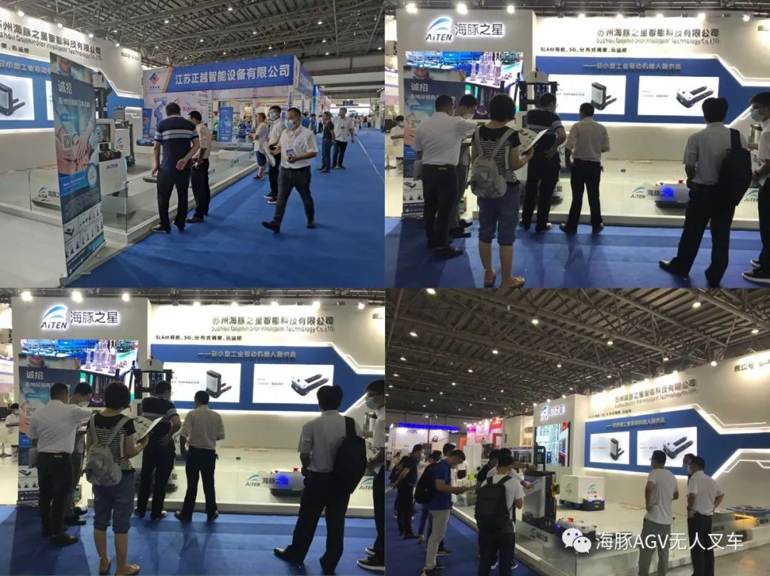海豚之星AGV機(jī)器人的展位是整個(gè)館里最亮的一家,科技感十足,大屏幕里播放著公司的客戶案例、3D倉(cāng)儲(chǔ)視頻以及前段時(shí)間由蘇州某電視臺(tái)來(lái)我司拍攝的宣傳視頻等,聲音響徹整個(gè)展館,引來(lái)了不少觀眾注目,銷(xiāo)售們熱情地向每個(gè)觀眾介紹著自家產(chǎn)品,并耐心地解答客戶的提問(wèn),互相交換各自的名片以便后期聯(lián)系。