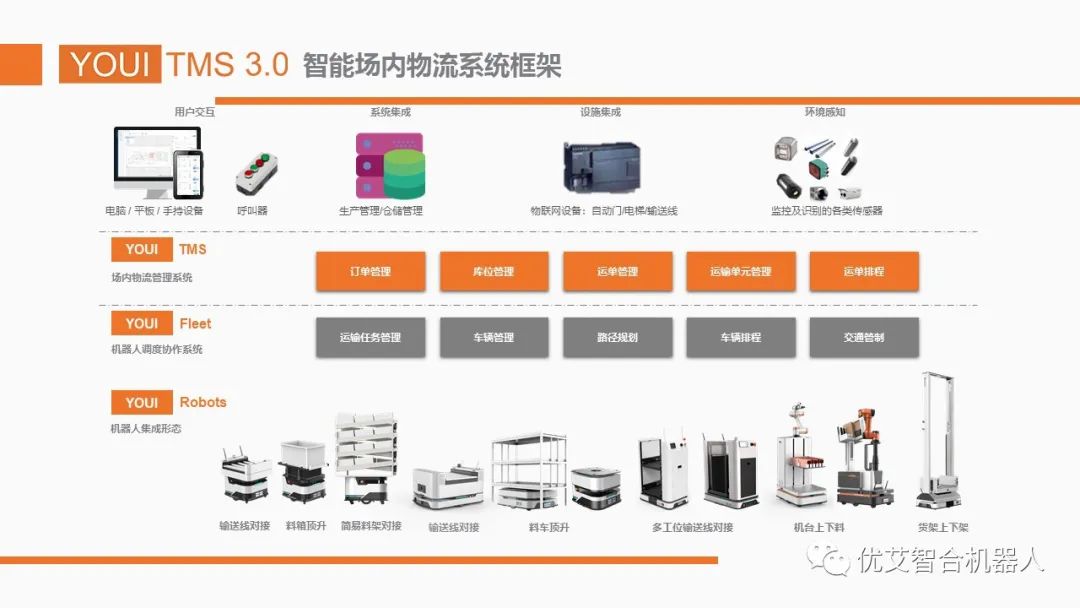 針對于此,硬件方面優(yōu)艾智合的移動底盤通過搭載機(jī)械臂、視覺、聲紋等各類集成形態(tài),可以在智能制造和智能運(yùn)維里面形成了多種解決方案;軟件方面優(yōu)艾智合更是推出場內(nèi)物流管控系統(tǒng)(YouiTMS 3.0),可以覆蓋智能制造行業(yè)所有場景,并與工廠的WMS、MES等系統(tǒng)無縫對接,實(shí)現(xiàn)全生產(chǎn)周期物質(zhì)與信息流映射,全數(shù)據(jù)在線。