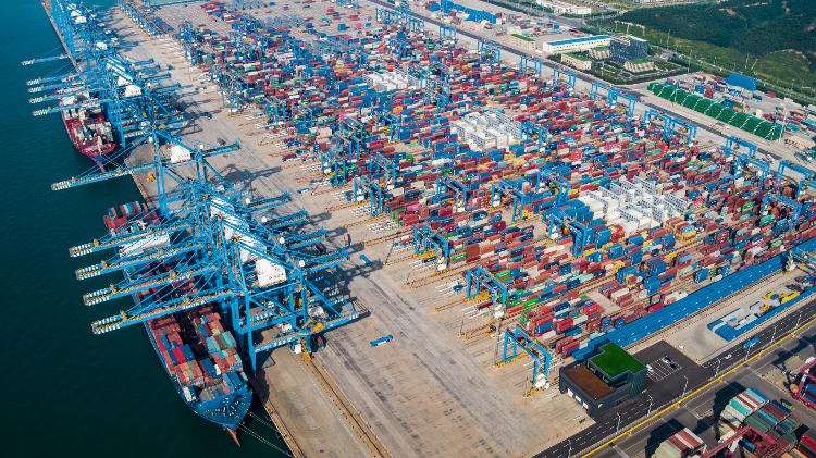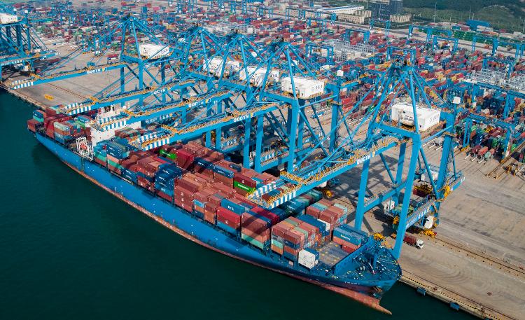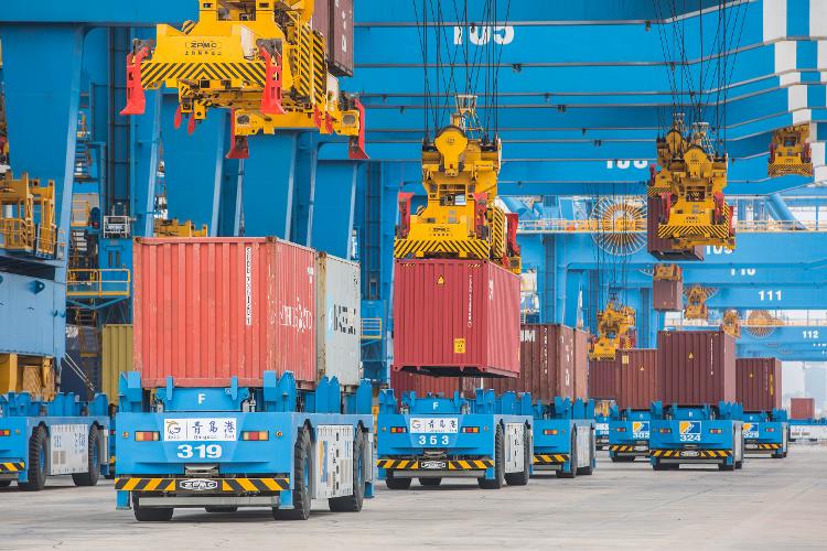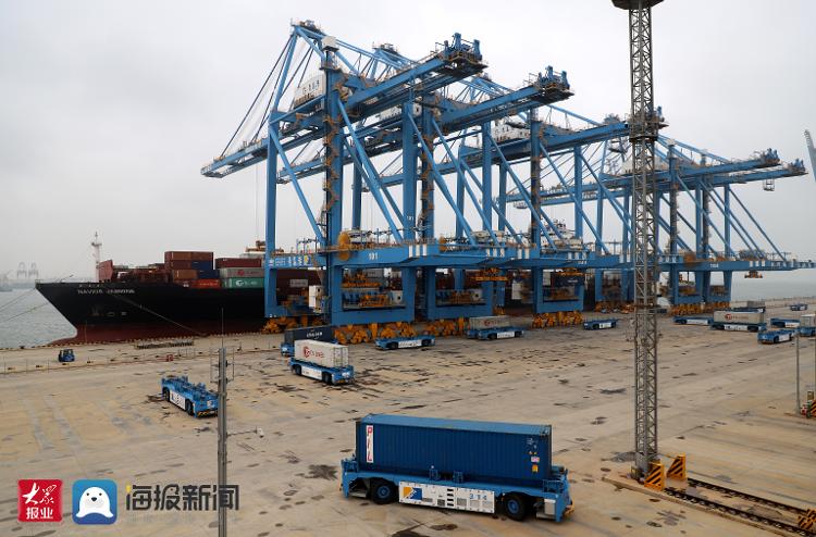 自動(dòng)化碼頭鳥瞰正在靠泊裝卸的集裝箱船橋吊將集裝箱放到智能AGV上AGV運(yùn)送集裝箱繁忙但有條不紊的AGV們軌道吊從AGV上將集裝箱取下軌道吊下面的AGV泊位具有充電功能,能保證AGV的持續(xù)運(yùn)行軌道吊將集...