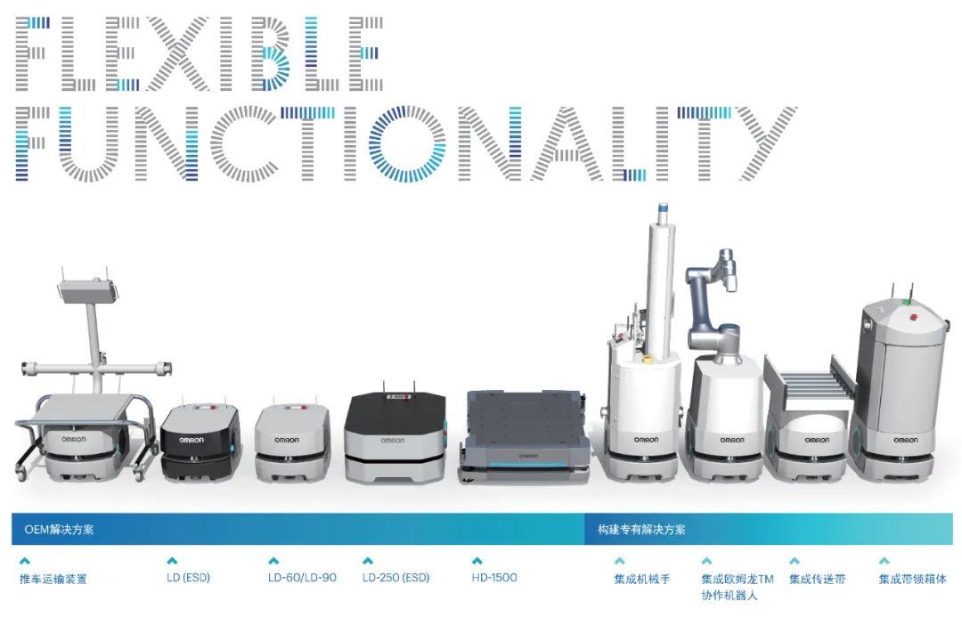 歐姆龍的移動(dòng)機(jī)器人解決方案極其靈活,可用于執(zhí)行各種任務(wù)和應(yīng)用。產(chǎn)品還具有可擴(kuò)展性,例如集成機(jī)械手、集成協(xié)作機(jī)器人、集成傳送帶、集成帶鎖箱體等等,適應(yīng)裝配站、潔凈室、裝卸碼頭、倉(cāng)庫(kù)等不斷變化的環(huán)境。