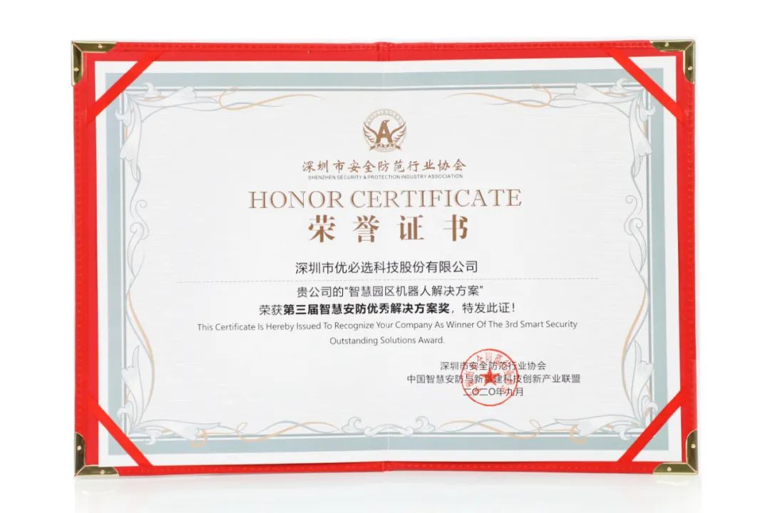 在同時舉辦的第三屆“智慧安防優(yōu)秀解決方案”評選活動中,優(yōu)必選科技憑借深厚的技術(shù)實力、創(chuàng)新能力以及行業(yè)影響力,以“智慧園區(qū)機(jī)器人解決方案”獲得“2020年第三屆智慧安防優(yōu)秀解決方案”殊榮。