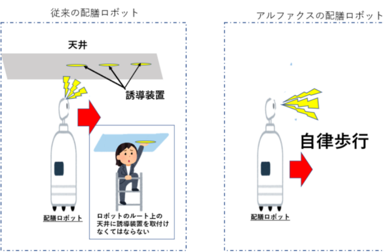 以往的送餐機器人多是在天花板上安裝步行引導標簽,沿著天花板設置的傳感器的路線步行的方式,這使安裝變得復雜,并且給安裝工作帶來了成本負擔等。