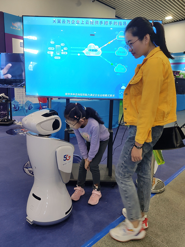 活動(dòng)現(xiàn)場,觀展市民在中國電信展廳與5G猜拳機(jī)器人比劃猜拳,機(jī)器人可以快速捕捉觀展市民的拳頭動(dòng)作,急速反應(yīng),在猜拳中處于不敗之地;有的觀展小朋友向“悟空”機(jī)器人發(fā)號(hào)俯臥撐、跳舞等指令后,機(jī)器人統(tǒng)統(tǒng)能遵照?qǐng)?zhí)行,留給小朋友一臉的好奇和興奮;也有觀展市民戴上VR設(shè)備,感受千里之外的360°全景高清視頻體驗(yàn)。
