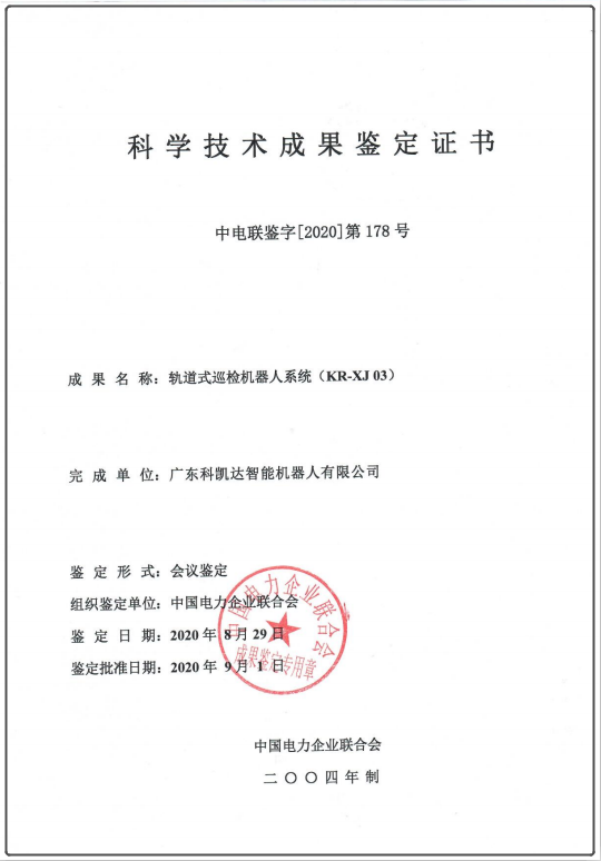 2020年8月,由科凱達(dá)公司自主研發(fā)并擁有產(chǎn)品全部知識(shí)產(chǎn)權(quán)的掛軌式巡檢機(jī)器人,在通過(guò)了各項(xiàng)實(shí)驗(yàn)測(cè)試后,舉辦了專家評(píng)定會(huì),雷清泉院士為主任的鑒定委員會(huì)確定該產(chǎn)品居于國(guó)際領(lǐng)先水平。