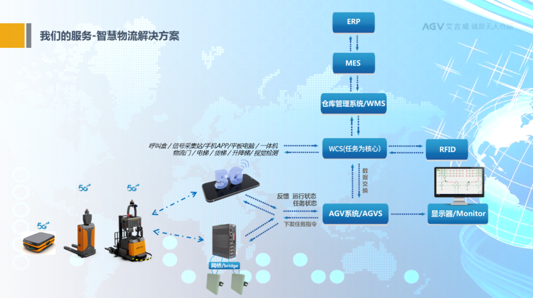 5G促使智慧工廠系統(tǒng)串聯(lián),工業(yè)生產(chǎn)各個(gè)關(guān)聯(lián)系統(tǒng)的孤立模式將被打破。艾吉威機(jī)器人可基于5G技術(shù)提供的AGV無(wú)人倉(cāng)運(yùn)解決方案,其調(diào)度系統(tǒng)AGVS可與ERP、MES等生產(chǎn)管理系統(tǒng)無(wú)縫對(duì)接;為優(yōu)化庫(kù)位管存、第三方外圍設(shè)施(自動(dòng)門(mén)、電梯)的融合,艾吉威推出WMS(庫(kù)位管理系統(tǒng))、WCS(倉(cāng)庫(kù)控制系統(tǒng)),為客戶(hù)打造工業(yè)生產(chǎn)物流信息閉環(huán)式管控,智慧工廠數(shù)據(jù)鏈互通,實(shí)現(xiàn)AGV業(yè)務(wù)無(wú)斷層無(wú)隔閡?;?G+工業(yè)互聯(lián)網(wǎng)、5G+無(wú)人駕駛等發(fā)展需求,加載5G技術(shù)的移動(dòng)搬運(yùn)機(jī)器人正在被大力開(kāi)發(fā)。近日,移動(dòng)搬運(yùn)機(jī)器人AGV領(lǐng)軍企業(yè)蘇州艾吉威機(jī)器人有限公司與中國(guó)聯(lián)合網(wǎng)絡(luò)通信有限公司蘇州分公司簽訂戰(zhàn)略合作協(xié)議,共建5G聯(lián)合實(shí)驗(yàn)室,雙方將充分發(fā)揮各自?xún)?yōu)勢(shì),推動(dòng)新一輪創(chuàng)新產(chǎn)業(yè)和5G+AGV服務(wù)領(lǐng)域的融合創(chuàng)新。