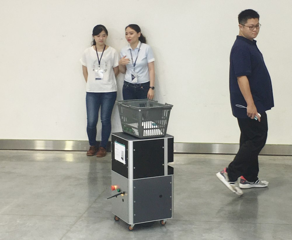另一無人搬運車導航方法是人員跟隨自走車,此系因應產(chǎn)業(yè)彈性自走車使用需求而開發(fā),可搭配不同裝置使用,如載貨箱、行李箱、購物籃..等,機體可載重50 -80公斤(實測可達100公斤),由于設計有多元感測裝置(Lidar、Sonar、3D Camera),以及信標發(fā)射器、無線遙控、SLAM的導航方式,因而俱備自主跟隨功能,使用者可用遙控器操控此自走車隨意跟人行走,可以車跟人也可以車跟車,方式包含信標(跟隨特定物品)、Lidar(跟隨人員)兩種模式,可運用于賣場、倉儲、物流運輸、工廠等需要搬運物品、需要服務、勞力的場合,可減輕人員負擔,節(jié)省勞動力、提高工作效率,協(xié)助企業(yè)打造全新的智慧服務,