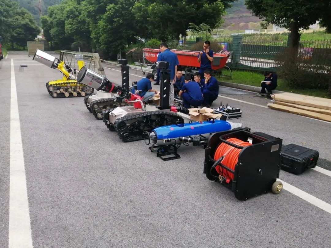 此次交付列裝的5臺消防特種機器人分別是:1臺防爆消防滅火偵察機器人(RXR-MC80BD),1臺消防排煙偵察機器人(RXR-YC100000JD),1臺防爆消防中倍數(shù)泡沫滅火偵察機器人(RXR-MC40BD(S)),1臺水下機器人(RXR-ROV),1臺消防偵察機器人(RXR-C68D)。