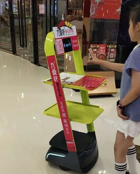 “歡迎光臨、歡迎品嘗,九鼎軒脆毛肚火鍋?!痹诠渖倘Φ那閭H、小朋友、小伙子等往往未見(jiàn)其“機(jī)”、先聞其聲。循聲而行,才看到全身貼滿九鼎軒宣傳貼紙、托盤(pán)上滿載宣傳冊(cè)和價(jià)目表的機(jī)器人“歡樂(lè)送”。