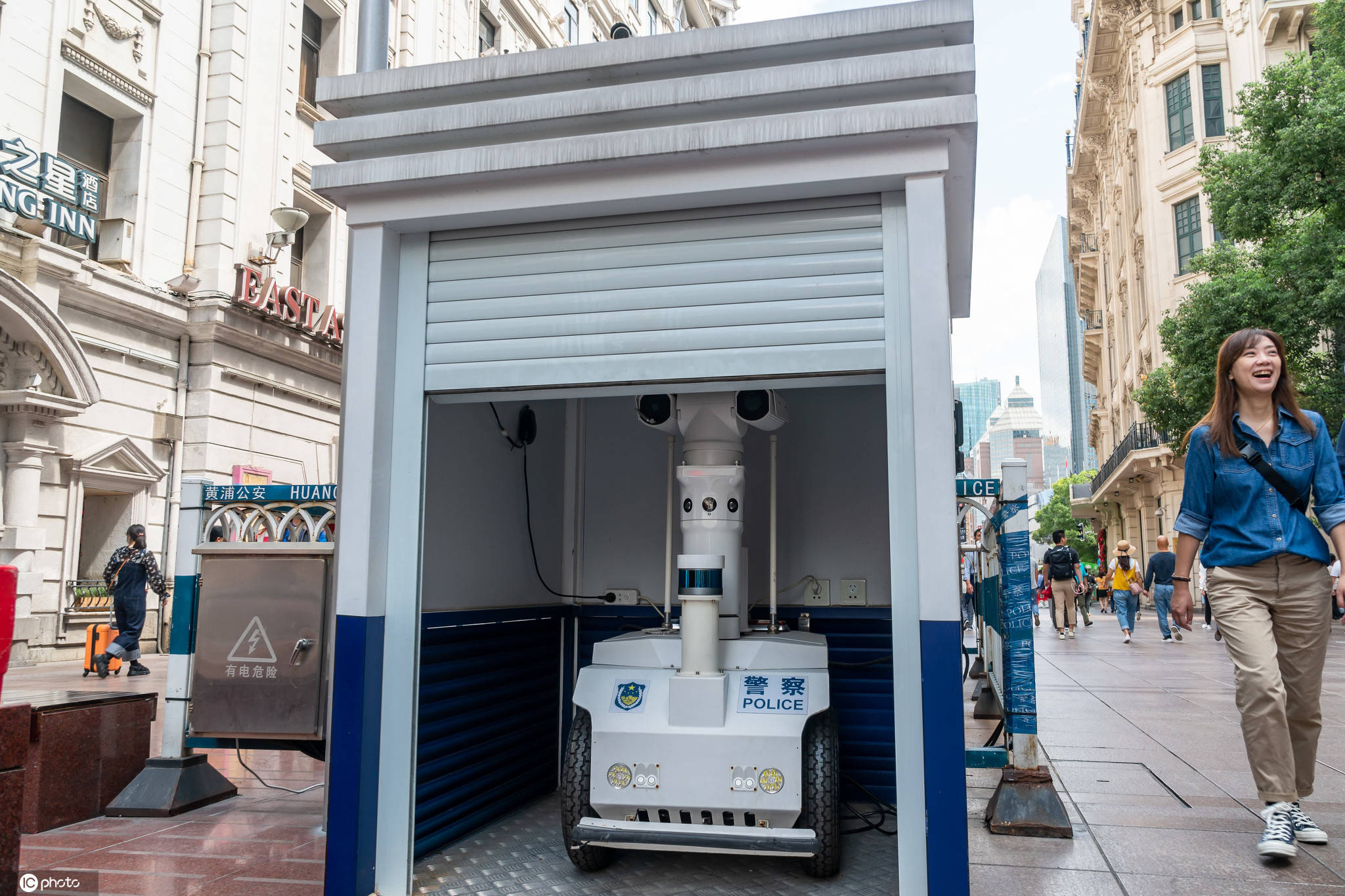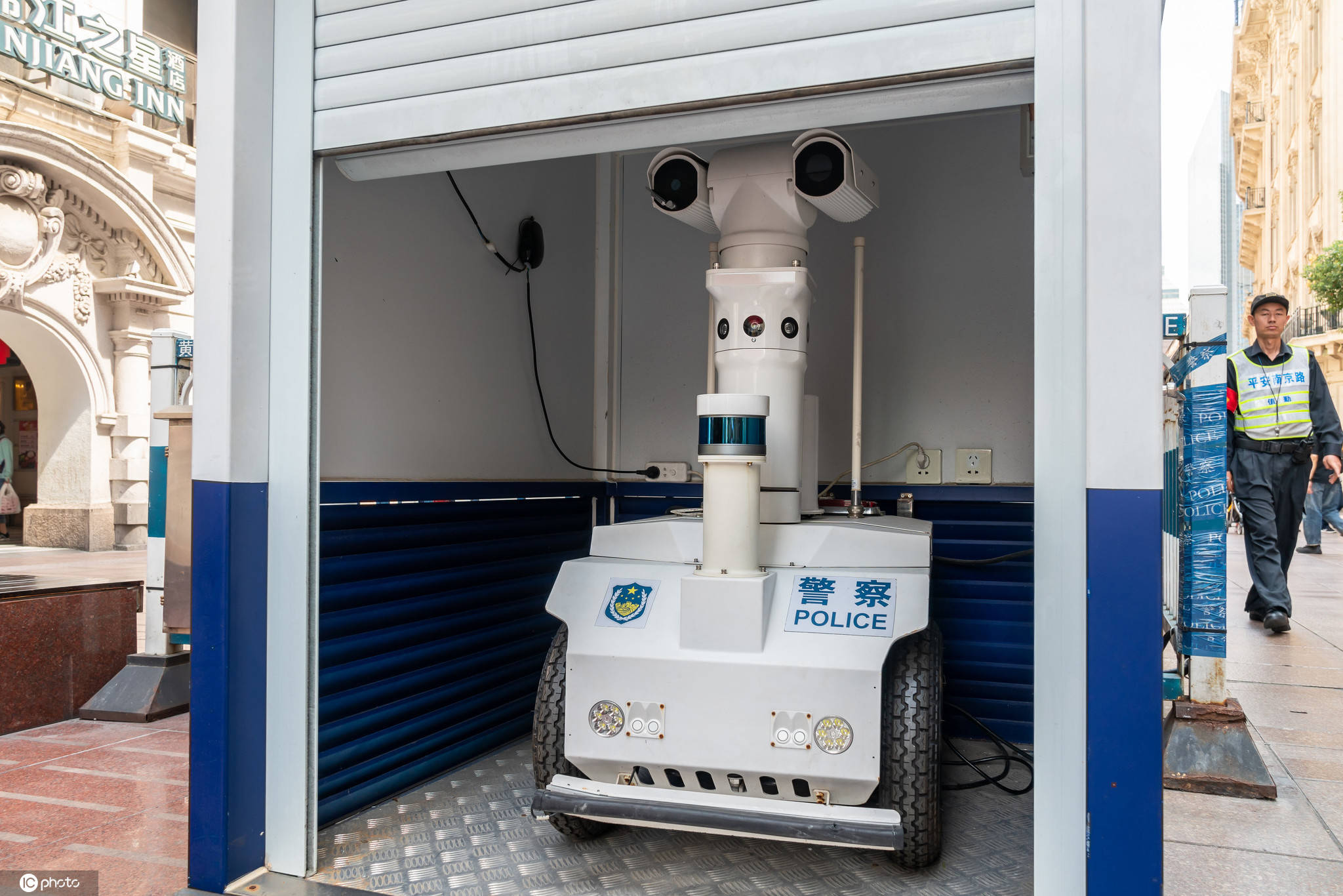 近日,“瓦力”有了自己的居所,有關部門在南京路步行街上為機器人建造了一間小屋,“瓦力”在沒有巡邏任務時,就萌萌噠得呆在屋子里。