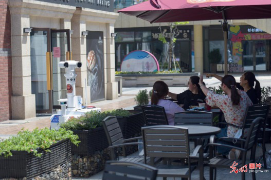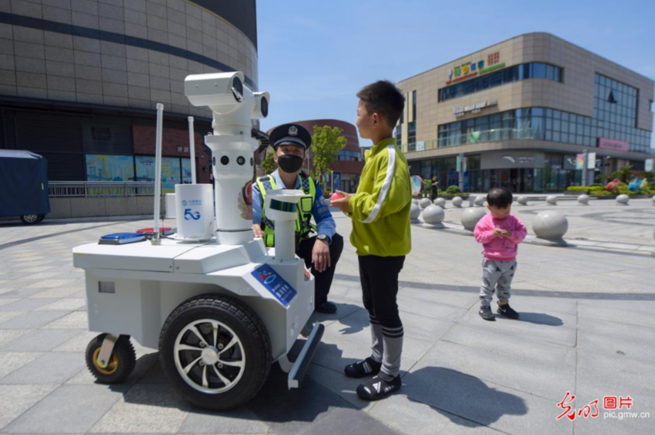 浙江省舟山市公安局普陀區(qū)分局東港派出所民警帶領首臺5G警用巡邏機器人在舟山市普陀區(qū)杉杉廣場上崗。該機器人可承擔智能防疫、巡邏防控、防范宣傳等工作任務。