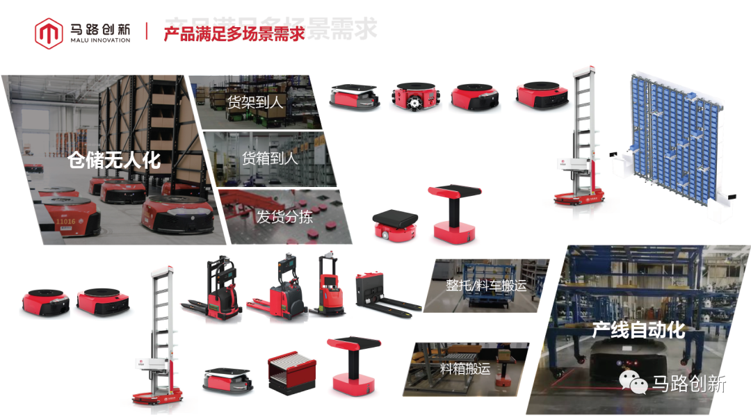 馬路創(chuàng)新的產(chǎn)品線經(jīng)歷了數(shù)年的自主研發(fā),先后推出了多款支持二維碼、VSLAM、激光SLAM以及混合導(dǎo)航等多種導(dǎo)航方式的機(jī)器人設(shè)備,以適配各種變化復(fù)雜的實(shí)際場景需求,可分為:舉升式AGV/AMR”產(chǎn)品,“移載式AGV/AMR”、“貨箱到人AGV”、“整托搬運(yùn)AGV”等。馬路創(chuàng)新目前為客戶提供兩大解決方案:倉儲無人化解決方案,產(chǎn)線自動(dòng)化解決方案,通過不同的產(chǎn)品組合,滿足不同客戶需求。