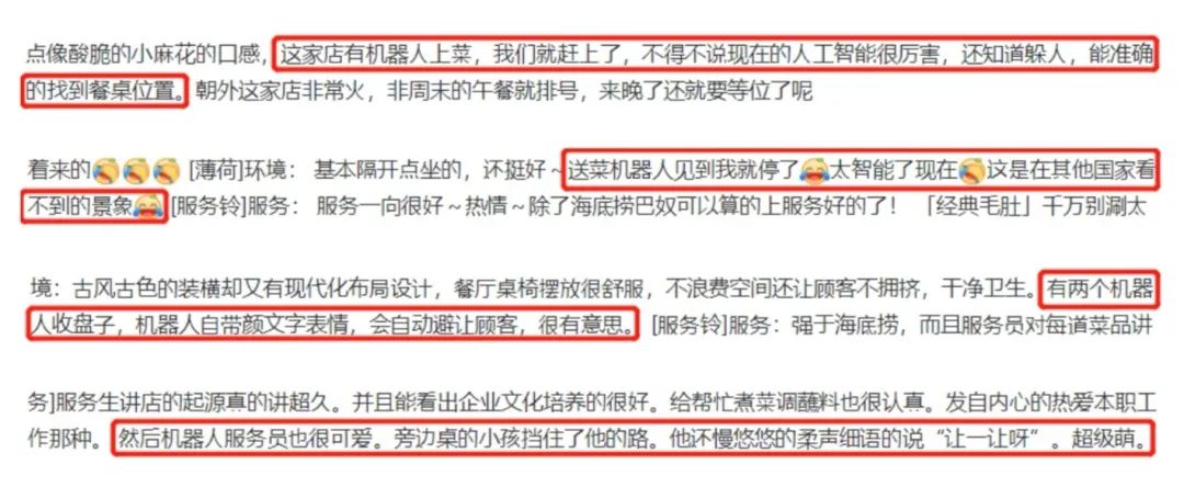 “很厲害,還知道躲人”,“送菜機(jī)器人見到我就停了,太智能了”,“機(jī)器人會(huì)自動(dòng)避讓顧客,很有意思”,“小孩子擋住機(jī)器人的路,機(jī)器人會(huì)柔聲細(xì)語(yǔ)的說(shuō)“讓一讓呀”,超級(jí)萌”