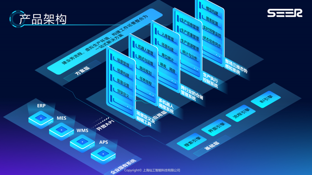 在基礎(chǔ)設(shè)施層之上,由場景定義及編輯工具、多機(jī)器人調(diào)度系統(tǒng)、跨行業(yè)的倉儲管理系統(tǒng)、生產(chǎn)執(zhí)行控制系統(tǒng)、整場三維態(tài)勢感知系統(tǒng)等應(yīng)用系統(tǒng)構(gòu)成,所有應(yīng)用由基礎(chǔ)層搭建,能夠在中臺內(nèi)共享數(shù)據(jù),實(shí)現(xiàn)更高的信息傳遞效率,便于統(tǒng)一的數(shù)據(jù)管理。