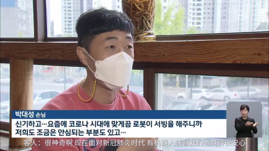 客人樸大成(音譯):“我感覺很神奇啊......現(xiàn)在面對新冠肺炎時代,有機器人送餐我們也覺得很安心...”