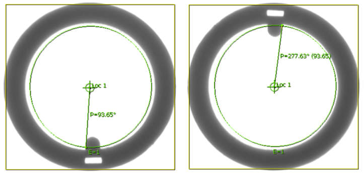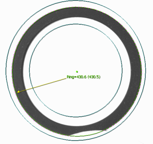 在圖像中找到圓形輪廓,計(jì)算出圓的直徑和中心點(diǎn)的位置;打開(kāi)異常值檢測(cè)功能,即使圓的外形不完整,也不影響測(cè)量結(jié)果;通過(guò)示教圖像和當(dāng)前圖像的中心點(diǎn)之間的偏差,進(jìn)行糾偏。