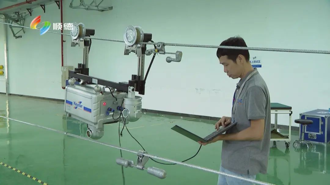 在廣東科凱達智能機器人有限公司的生產(chǎn)車間,工作人員正在調(diào)試機器。這些像小蜘蛛一樣懸掛在線纜上的機器人,就是高壓線路巡檢機器人。高壓線路巡檢機器人不僅可以代替工人爬上百米高的電纜,還可以日行百里,巡檢電路,為安全供電保駕護航。