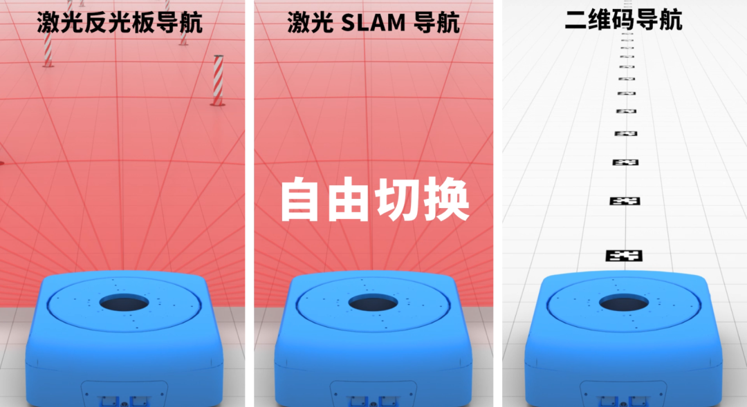 SEER:激光 SLAM 導(dǎo)航,激光反光板導(dǎo)航,二維碼導(dǎo)航,三者可以自由切換。
