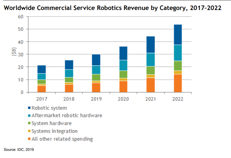 據(jù)美國國際數(shù)據(jù)公司IDC預(yù)測,從2017年開始,世界商用服務(wù)機(jī)器人市場將以每年20%的增長率增加,將在2022年突破530億美元。