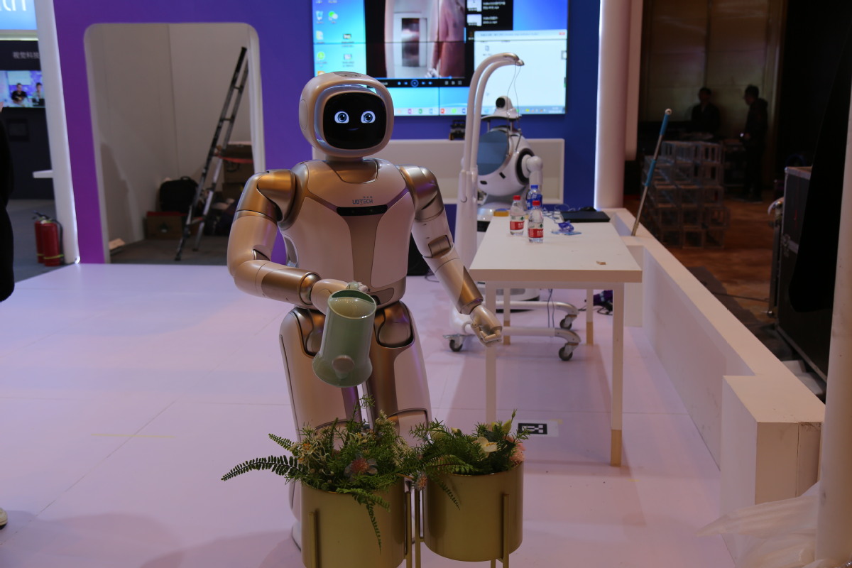 “來(lái),足球踢起來(lái)!”會(huì)議中心里,大型仿人機(jī)器人Walker正在和一只足球互動(dòng),輕盈的姿勢(shì)引來(lái)了布展工人的打趣。Walker個(gè)頭不高,卻可以快速穩(wěn)定地在地面行走,也可以運(yùn)用靈活的雙臂端起桌子上的一杯水。甚至,他在澆花的過(guò)程中,能準(zhǔn)確識(shí)別噴壺的位置、大小和形狀,去規(guī)劃行動(dòng)路徑,通過(guò)7個(gè)自由度的手臂,調(diào)整抓握姿勢(shì)以完成操作。