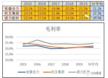 據(jù)網(wǎng)上公布的合力、杭叉和諾力的財報數(shù)據(jù),國內(nèi)三大叉車企業(yè)近五年的毛利基本表現(xiàn)平穩(wěn)且總體呈下滑趨勢,可見第二、三梯隊的叉車企業(yè)毛利情況更為堪憂。