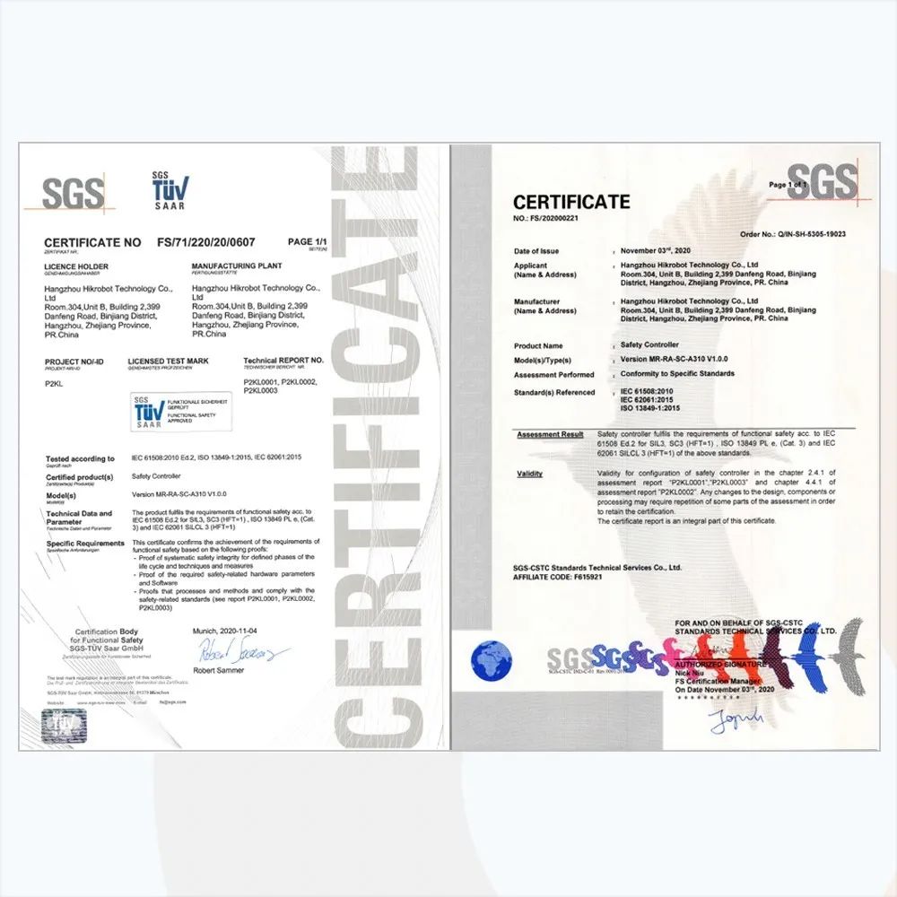 日前,???/a>機(jī)器人基于IEC 61508, IEC 62061, ISO 13849功能安全標(biāo)準(zhǔn)自主研發(fā)設(shè)計(jì)的AMR安全控制器榮獲全球公認(rèn)的檢驗(yàn)鑒定測(cè)試和認(rèn)證機(jī)構(gòu)SGS頒發(fā)的經(jīng)德國(guó)DAKKS和中國(guó)CNAS雙資質(zhì)認(rèn)可的SIL3, PLe功能安全認(rèn)證證書(shū),成為了全球首家獲得該類控制器工業(yè)領(lǐng)域最高安全等級(jí)SIL3, PLe產(chǎn)品認(rèn)證的企業(yè),并攜雙資質(zhì)證書(shū)亮相第三屆進(jìn)博會(huì)。