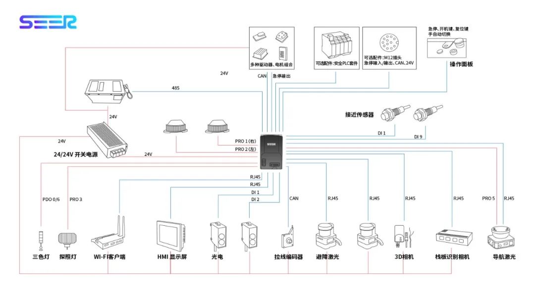 任經(jīng)理說(shuō),一臺(tái)自動(dòng)叉車主要包含叉車本體和自動(dòng)控制單元,其中叉車本體中的行走電機(jī)、轉(zhuǎn)向電機(jī)、油泵電機(jī)需要受控制單元的控制。仙工智能(SEER)則提供整體自動(dòng)控制單元,其中包括 SRC 系列核心控制器、導(dǎo)航激光、驅(qū)動(dòng)器、轉(zhuǎn)向電機(jī)、拉線編碼器、距離傳感器、超聲傳感器、碰撞傳感器、以及急停、指示燈、電源、各類聲光報(bào)警燈、線纜等一系列周邊。