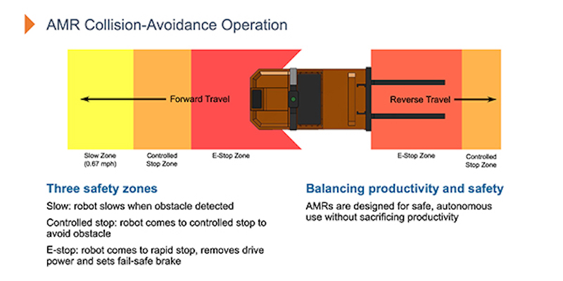 在評估AMR的防撞能力時(shí),請尋找一個(gè)在車輛的前部和后部均具有安全區(qū)的機(jī)器人。應(yīng)該對機(jī)器人進(jìn)行編程,使其在遇到障礙物的位置和速度時(shí)做出適當(dāng)?shù)捻憫?yīng)。