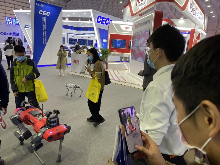在中國(guó)電科的展臺(tái)前,兩只機(jī)器狗成了最大的明星,紅的機(jī)器狗大一點(diǎn),銀白色的機(jī)器狗個(gè)頭小一點(diǎn)。跟我們印象,笨重的機(jī)器狗不同,這兩只機(jī)器狗非常靈活,除了能小步挪移、快速前進(jìn)、輕松爬坡,還能做俯臥撐。