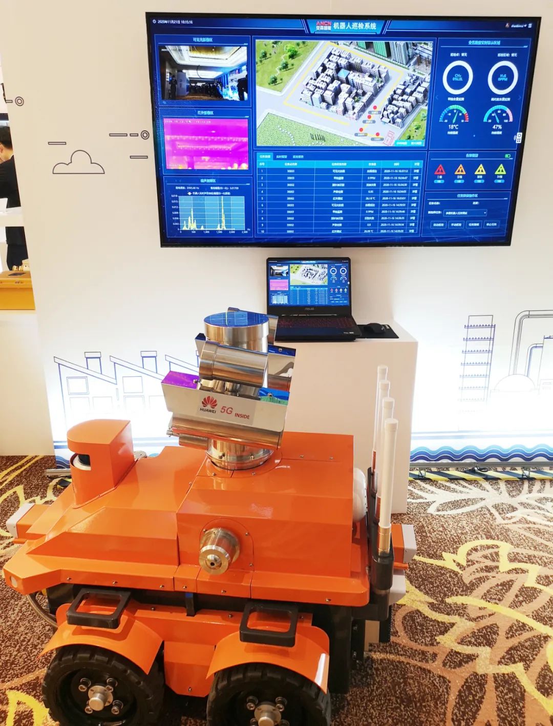 在本次峰會上安森智能攜手華為公司共同推出了“機器人+5G+云平臺”的智慧巡檢解決方案。新一代5G防爆巡檢機器人,集成了激光遙測、紅外成像、聲波頻譜分析等先進(jìn)技術(shù),利用計算機軟件大數(shù)據(jù)分析、5G通信技術(shù)和云平臺技術(shù),在易燃易爆、有毒有害、石化?;I(lǐng)域巡檢時,智能機器人能夠代替人工巡檢,及時發(fā)現(xiàn)“跑、冒、滴、漏”、異聲異響、異味異熱等安全隱患,及時的給出故障源和故障處理辦法并主動預(yù)警,避免設(shè)備故障和安全隱患進(jìn)一步擴大,有效保障企業(yè)安全生產(chǎn)。該產(chǎn)品一經(jīng)展出就憑借專業(yè)的核心技術(shù)獲得了與會者的高度評價和關(guān)注。