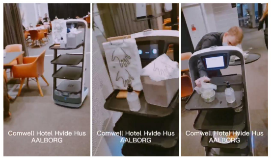 經(jīng)過(guò)簡(jiǎn)單的環(huán)境調(diào)試,“歡樂(lè)送”便在Comwell酒店的餐廳里開始巡航服務(wù)。由于疫情期間,大家極度注意衛(wèi)生條件,所以工作人員就先讓歡樂(lè)送在餐廳里配送消毒洗手液??勺尵频旯ぷ魅藛T吃驚的是,就餐的客人竟然無(wú)師自通開發(fā)出了其他用法。在“歡樂(lè)送”來(lái)回巡航的過(guò)程中,客人們會(huì)自然地使用“歡樂(lè)送”送來(lái)的消毒洗手液,還自覺(jué)把自己吃干抹凈的盤子放在歡樂(lè)送的托盤上,非常順其自然地接受歡樂(lè)送服務(wù)。去國(guó)外旅游過(guò)的國(guó)人都應(yīng)該知道,國(guó)外的咖啡廳、快餐店、KFC、麥當(dāng)勞等餐飲店是不會(huì)專門雇傭收餐桌的服務(wù)員的,一方面是受制于人口數(shù)量,另一方面是文化環(huán)境使然。雖然普渡科技的機(jī)器人大家族里,承擔(dān)回盤任務(wù)的機(jī)器人另有“好啦”,但在“好啦”不在場(chǎng)的情況下,“歡樂(lè)送”也是可以代勞一二的。
