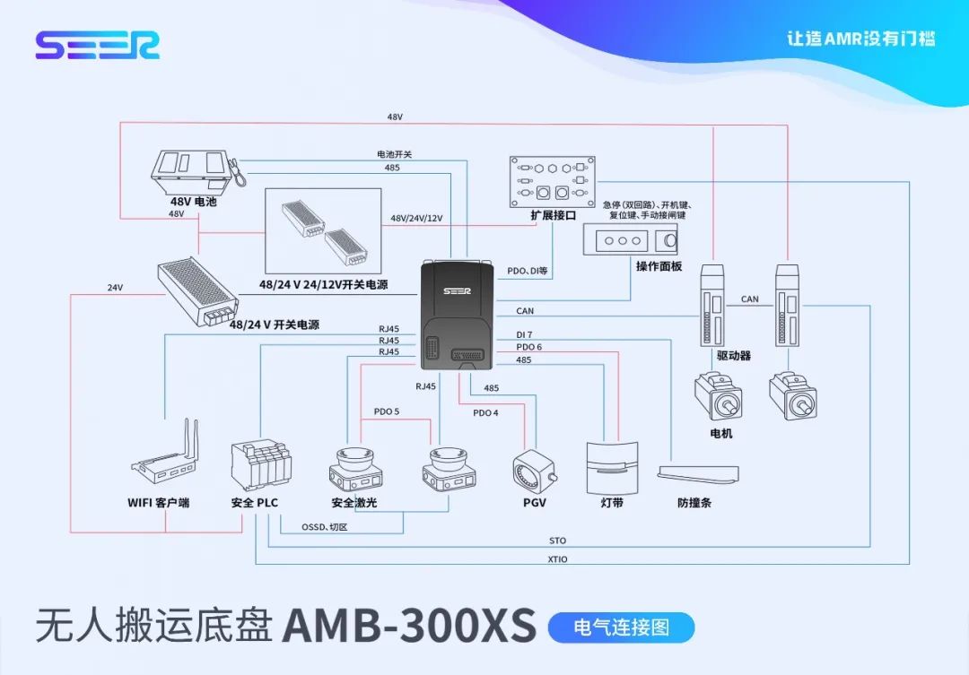 打造一臺高性能的移動機器人,電氣部分最關(guān)鍵的就是需要一臺功能強大的核心控制器,除此以外還需要驅(qū)動、激光雷達、無線模塊、各類傳感器、電池、電源、擴展接口、氛圍燈、揚聲器、操作面板等。