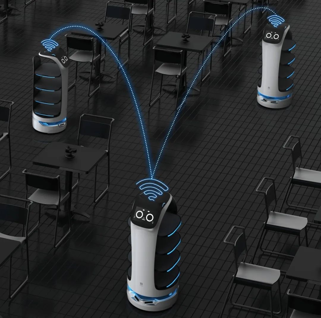 除了PUDU SLAM多傳感器融合算法,普渡科技獨(dú)立研發(fā)的多機(jī)自組網(wǎng)分布式調(diào)度系統(tǒng),利用物聯(lián)網(wǎng)通信方案,使每臺(tái)機(jī)器在不依賴外部網(wǎng)絡(luò)的情況下,與同一場景里的任意機(jī)器直接通信,快速?zèng)Q策配送路徑,靈活應(yīng)對(duì)高動(dòng)態(tài)場景。