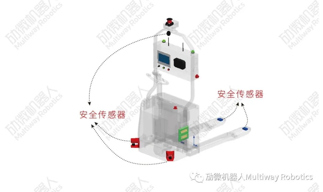 在無人叉車AGV運(yùn)行過程中,難免出現(xiàn)極端異常工況,比如前方突然闖入某物品,基于極端工況使用安全,勱微無人叉車AGV車頭行駛端配備有環(huán)形電子觸邊,電子觸邊一旦被緊急碰撞,無人叉車AGV會(huì)自動(dòng)停車并發(fā)出急促告警聲同時(shí)警示紅燈高亮預(yù)警。為避免碰撞發(fā)生,勱微無人叉車AGV車身兩側(cè)還自配有紅色急停開關(guān),急停開關(guān)只要被按下,則立即停車并警報(bào)。